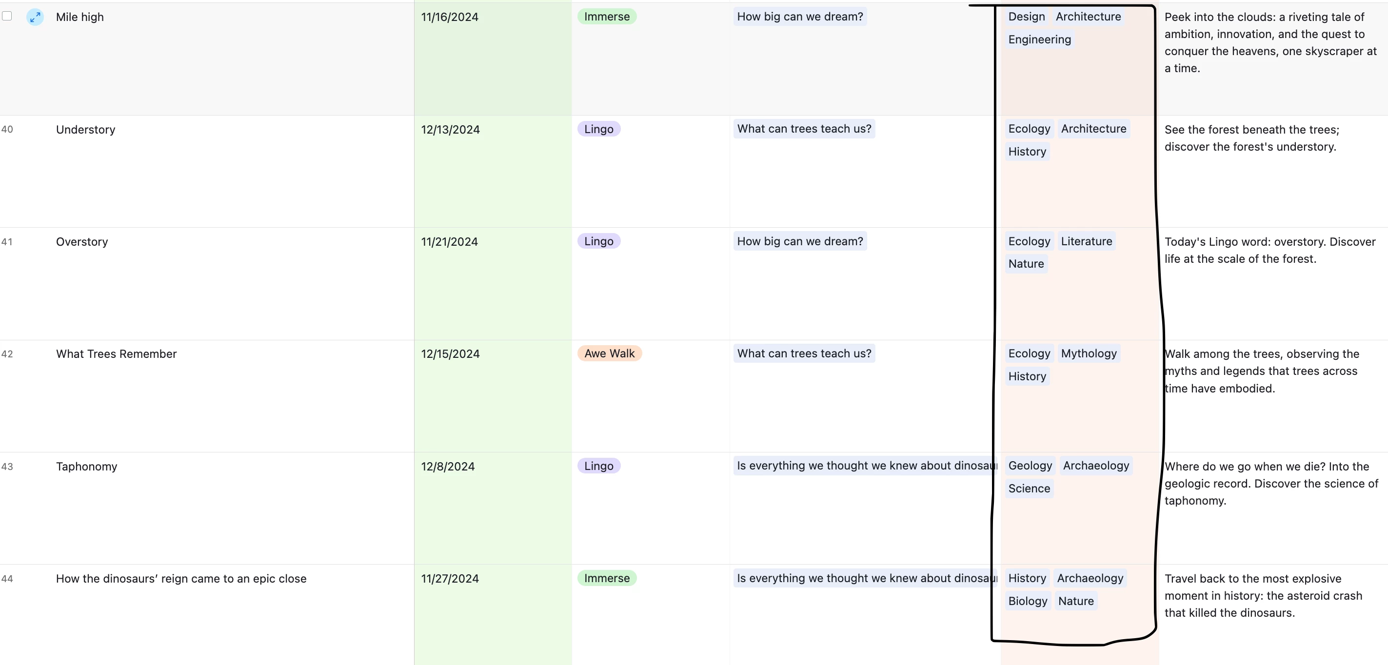 Thanks in advance for your thoughts. I have a items shown in the attached that are different content that have different topics associated with them (you can see the column of topics). I'd like to get a view in Airtable where I see all of these segment names associated with the individual topics in lists in 1 view. The way I've thought about doing it is to try grouping them, but when I group them, they sort with the 4 topics together, not as individual topic lists. Grateful for any advice on how to do this!