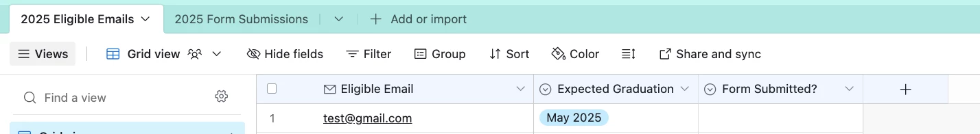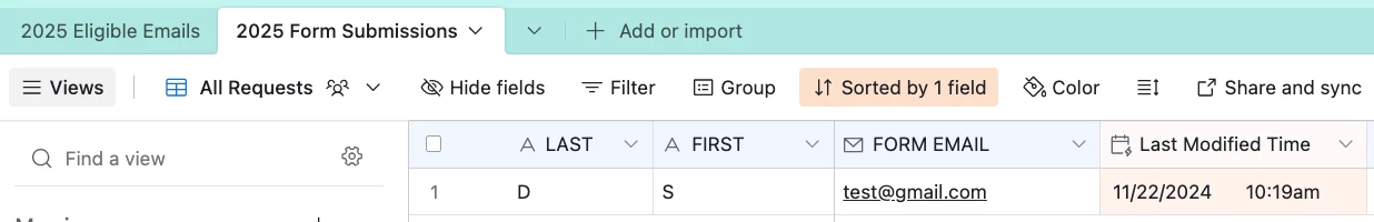 Hi all, I am using Fillout Form integrated with Airtable. I have two tables in one airtable base. One table lists all the eligible emails that can login and fill out the form. The second table is where the form submissions land. I would like to be able to tell who has actually submitted a form from the "Eligible email table".
