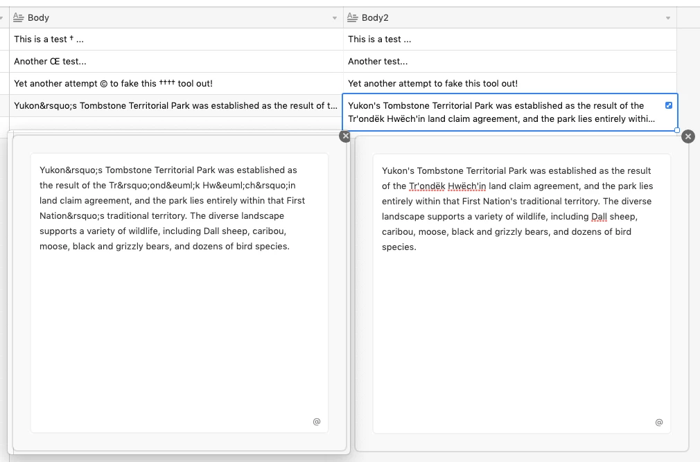 This could be done with formulas looking for every instance of the “odd” texts and either eliminating them altogether or transforming them into their decided equivalents. Or, you could do something similar in a Script Block. Both of these options come with a lot of issues such as knowing in advance all of the “odd” situations the source content may include. This is not easily predictable and Airtable doesn’t provide the ability to perform a global HTML entity transformation (i.e., Script Blocks do not allow use of the DOM thus ruling out a universal decoding process).