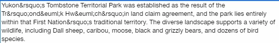 Yukon’s Tombstone Territorial Park was established as the result of the Tr’ondëk Hwëch’in land claim agreement, and the park lies entirely within that First Nation’s traditional territory. The diverse landscape supports a variety of wildlife, including Dall sheep, caribou, moose, black and grizzly bears, and dozens of bird species.
