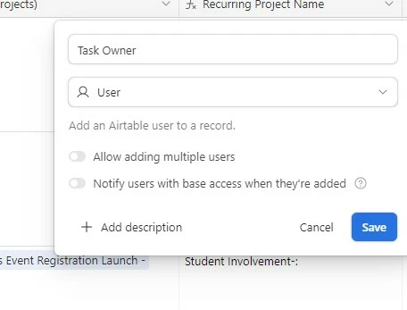 Hello -- is there a way to sort the automatically-generated list of collaborators in a User field? We have an interface where collaborators can create a new task and assign a task owner via a User field. The users appear to be in the order they were added to the base. It would be a lot easier for them if the User field could be alphabetized but I'm not seeing that option when editing the field (screenshot attached). What am I missing?