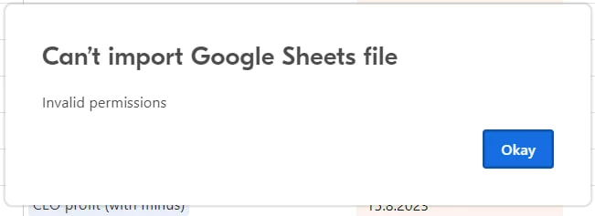 Привет! Я пытаюсь импортировать данные из Google Таблиц в AirTable через «Импорт данных> Google Таблицы». Доступ к аккаунту Google открыт. Я выбираю нужную мне таблицу и настраиваю столбцы для импорта, но возникает ошибка. Пытаюсь ответить и снова открыть доступ, но ошибка остается.