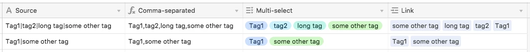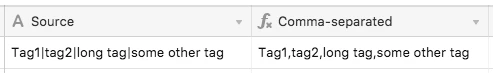 Brand new airtable user here. I’m currently trying to wrangle a podcasting website that has two hundred episodes on it (well, technically, our 200th weekly episode comes out tomorrow). I was able to take a CSV dump out of the Wordpress website I’m using and import it into airtable. One of the things I’m trying to fix is our tagging scheme. However, the CSV dump concatenated the various tags into a single field that is delimited by “|” (pipe) characters. I’d like to first get all the episode tagging into the system, and then start reworking things (I plan to outsource the work of re-tagging stuff in the site, so I plan to use airtable for planning all that out).