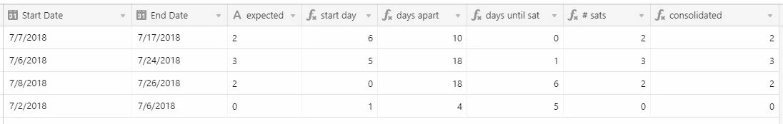 {consolidated} = ROUNDDOWN((1+(DATETIME_DIFF({End Date},{Start Date},‘days’)-(6-WEEKDAY({Start Date})))/7),0)