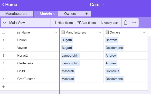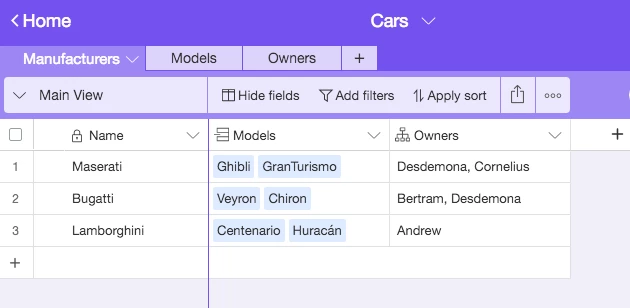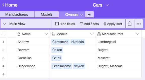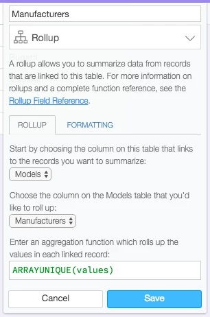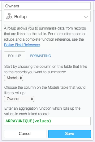 This means that this field looks at the Models field here, then goes to look at the table to which it’s been linked (which in this case is also titled “Models”), then returns the value found in a specified field in the Models table (in this case, the “Owners” field). The ARRAYUNIQUE aggregation function is there to ensure that you don’t have repeats of owners’ names (e.g., in this example, Andrew owns two different Lamborghini models, but his name only shows up once).