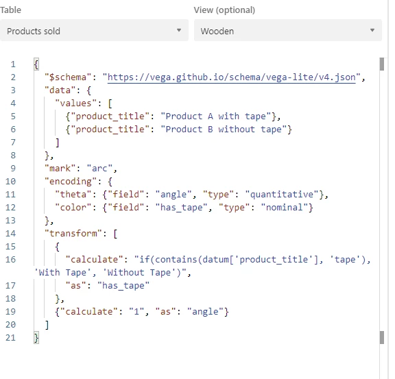 Problem Description: I am attempting to create a simple pie chart using Vega-Lite within Airtable. The goal is to visualize two categories, "With Tape" and "Without Tape," based on a "product_title" field.