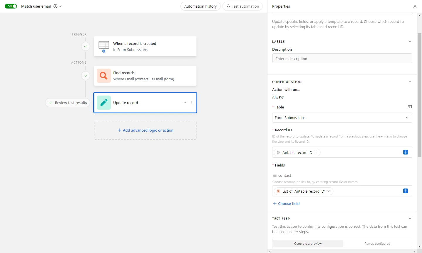 4. Create an automation that will trigger every time a "Line Item" record is created, and its action will be to paste the value from the field from step 2 into the linked field to Invoices