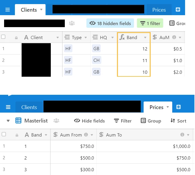 How can I access the other columns in Prices via joining on Band? I can’t make it a linked field as it is calculated??