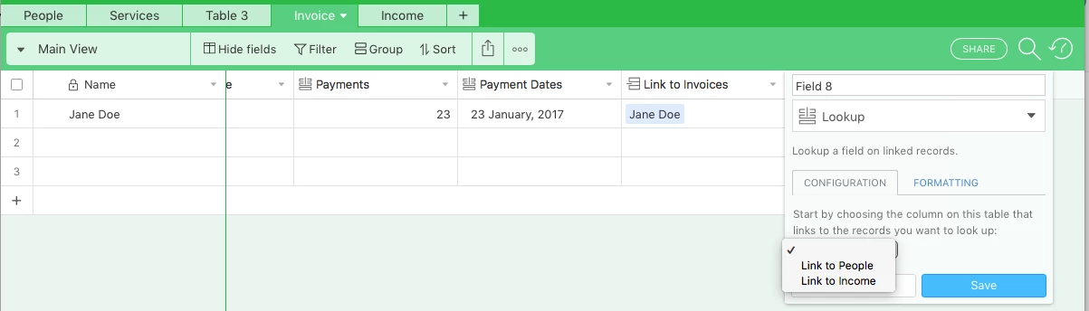 Here is an example self join linked field ( works fine ) then a field to do lookup on that join field. Note that the invoice table is not one of the optional selections. In this case I want to find the difference of the sum of all of the payments and invoices for a particular client, to arrive at an outstanding amount.