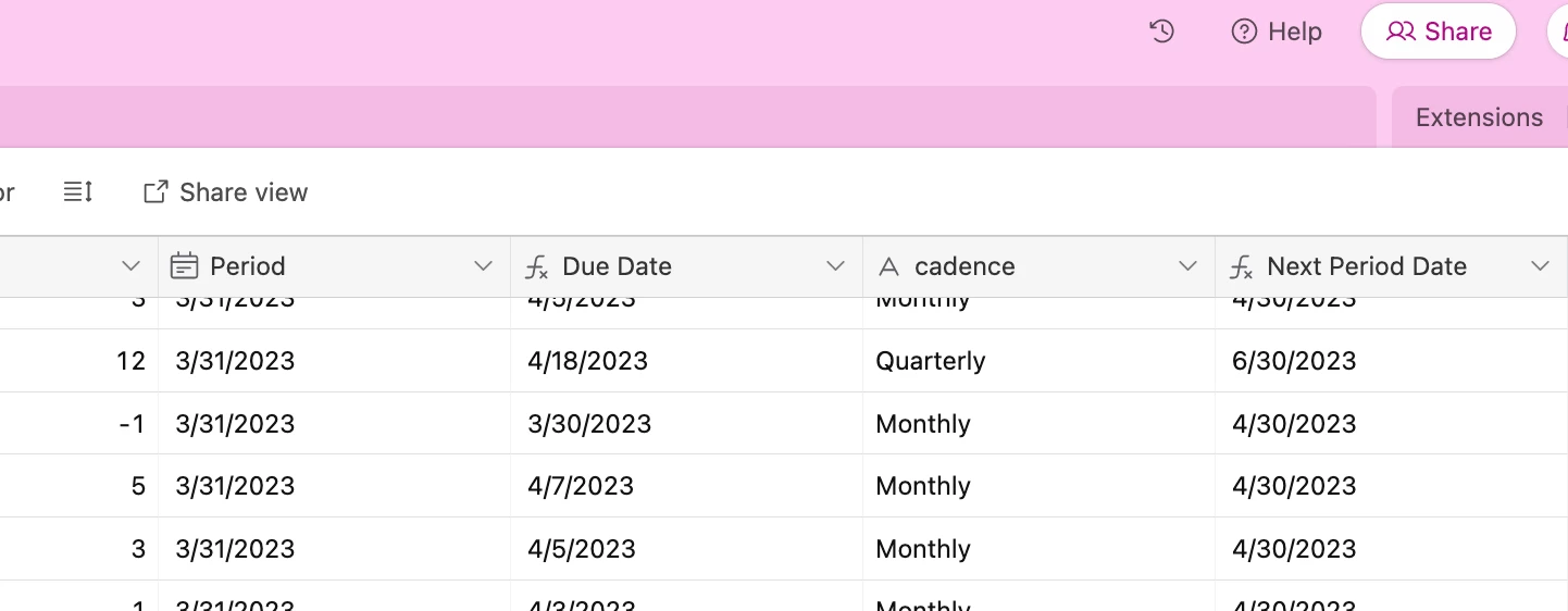 I am trying to get a formula or automation to update the period field in the attached screenshot based on the cadence. I have tried using automations, but it essentially circular references itself and won't allow me to select the Period to replace with Next Period, because Next Period is calculated based on Period and Cadence.