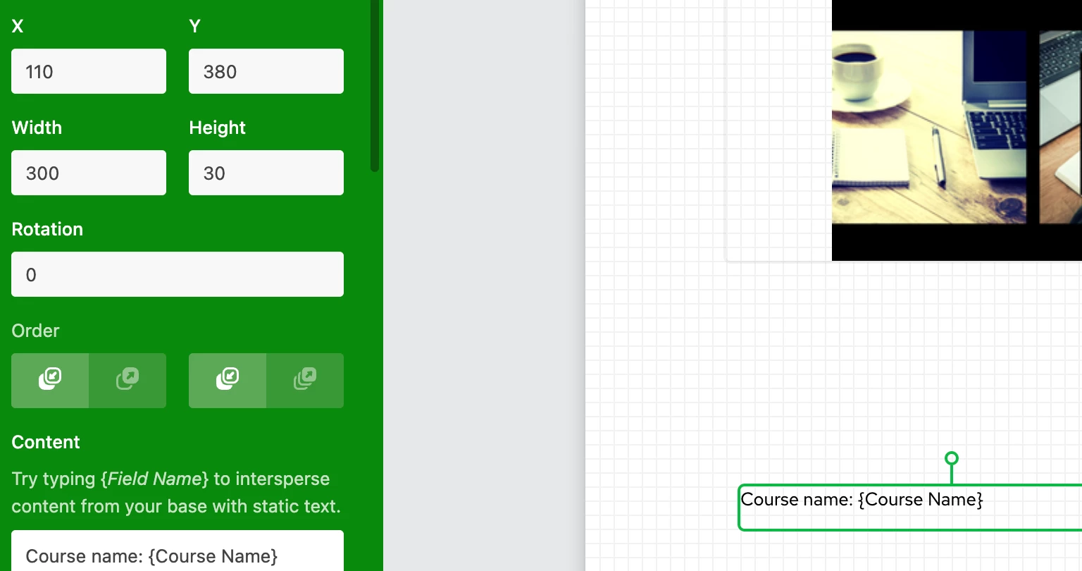 I'm trying to use curly brackets to insert field content into a text box, but it shows up as "Course Name: {Course Name}" on the designed page instead of inserting information from the Course Name field. How can I make Page Designer recognize that that's a field name?