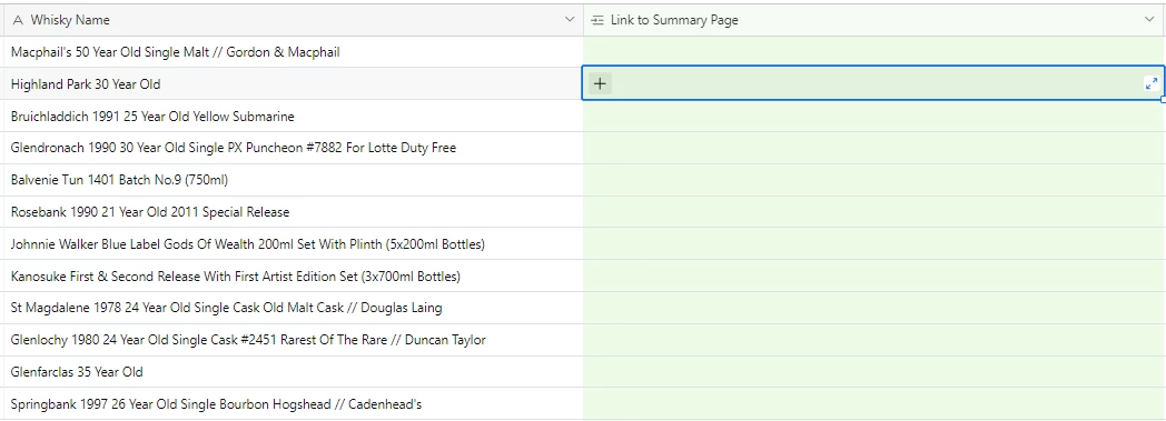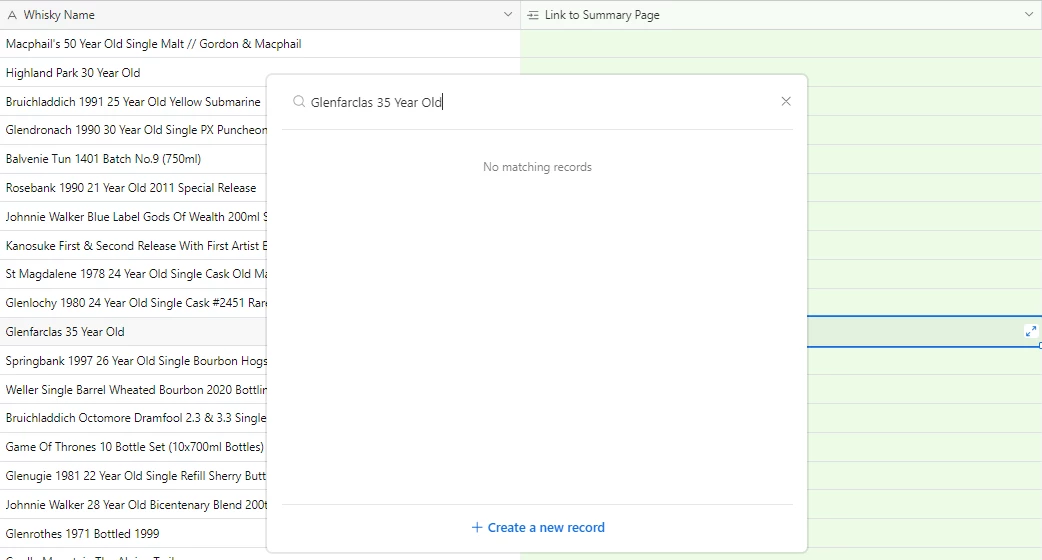 I'm pasting a single-line text field ("Whisky Name") into a linked field ("Link to Summary Page"), and it used to paste all the names across into the linked field. The action was that if a name matched with an existing one, it linked it to the existing one and if it didn't, it created a new line in the summary table.