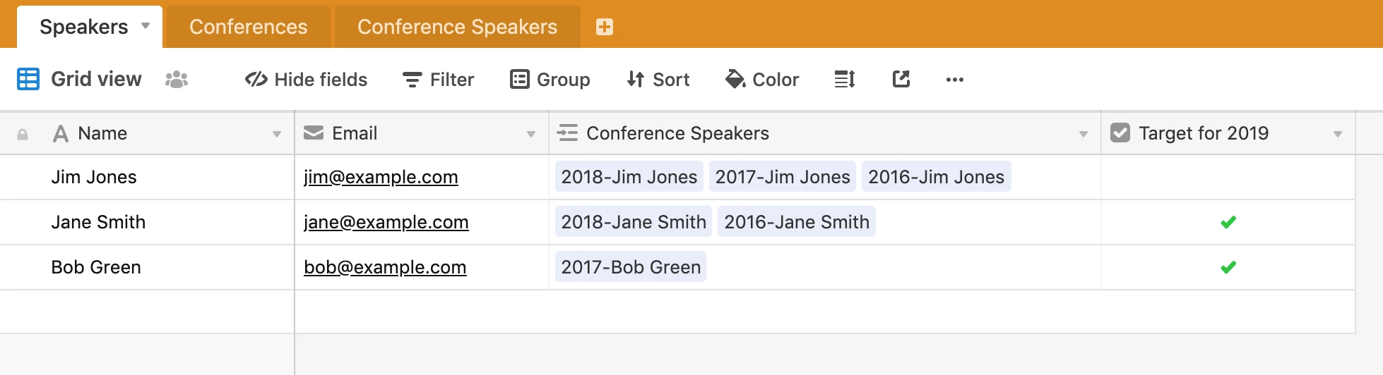 Goal: Every year I put a conference together and I want to make the booking process easier by having a full database of past speakers, years they spoke, and targets for next years’ conference in terms of who I want to speak.