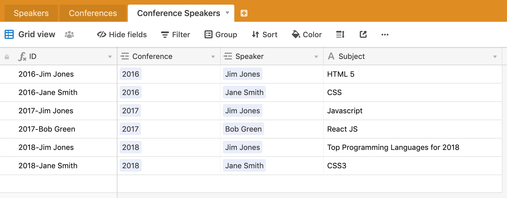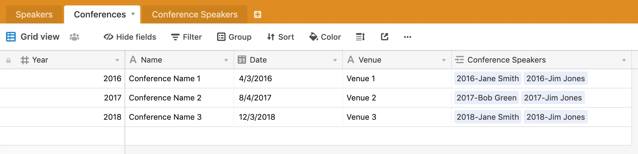 I created a “Speakers” table, which has the names and all of the contact information about each speaker. I also created a “Years Spoke” table, which lists all of the years I’ve done the conference.