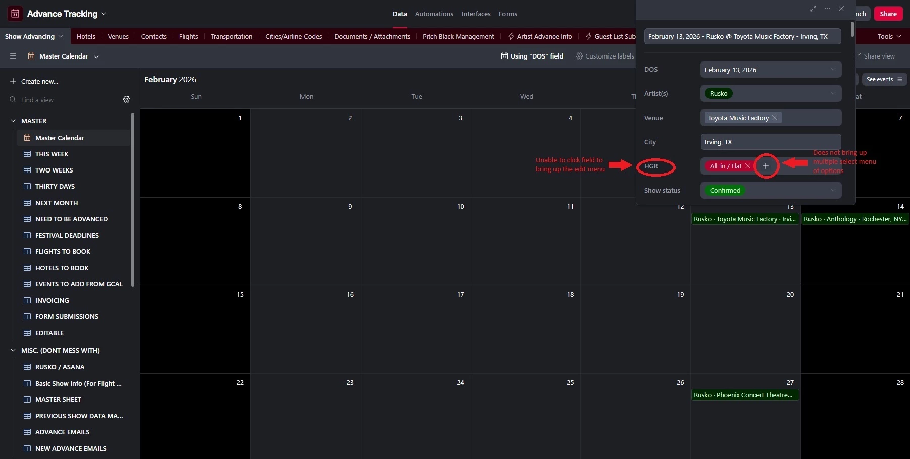 Recently I have noticed that the more compact menu that is displayed when a record is clicked in calendar view seems to have reduced functionality. Specifically, I can no longer edit fields from that menu and ‘multiple select’ fields seem to not allow for options being chosen from that menu anymore. However, when you click to expand that record view, everything works as its supposed to. The photo I have attached points out what I am referring to.