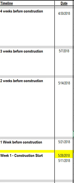 But you also might consider structuring your timeline the other direction - where “4 weeks before construction” is a field (column), rather than a record (row). This would probably require the restructuring of other data as well, but I think it might benefit you in the long run to think of things this way.