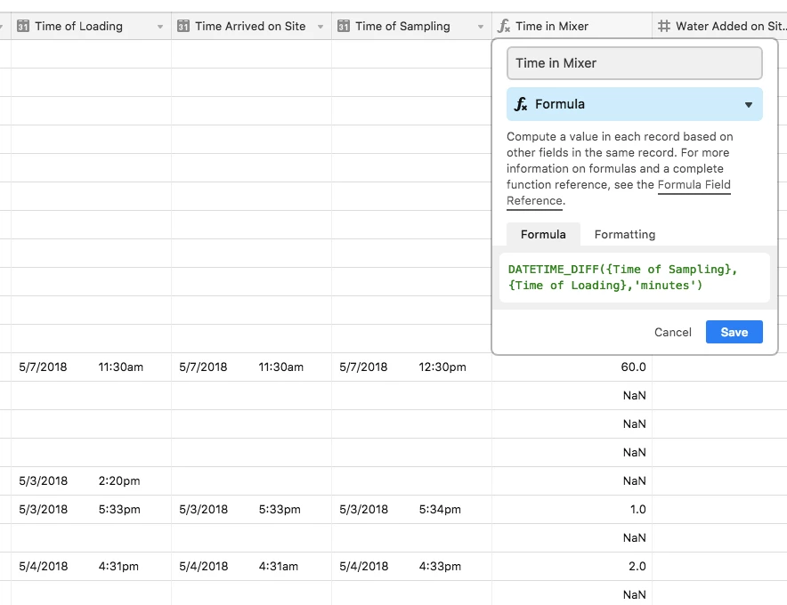 I define the formula that applies to the “Time in Mixer” column - any new record I create will apply this formula, which looks at the “Time of Loading” date field and the “Time of Sampling” date field from the same record (ie, horizontally), and uses them to calculate a duration in the “Time in Mixer” field.