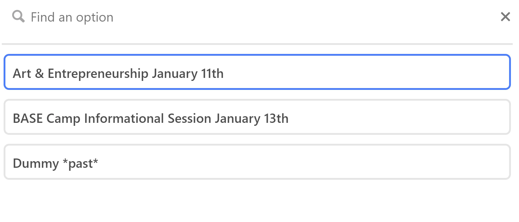 Hello! I'm creating a check-in form for attendees at events. The goal is to only make one form that links back to an event grid. As events are added to the event grid, they will populate as options to select in the check-in form. Is there anyway to make sure that attendees cannot click past-dated events when using the form? Thanks in advance!