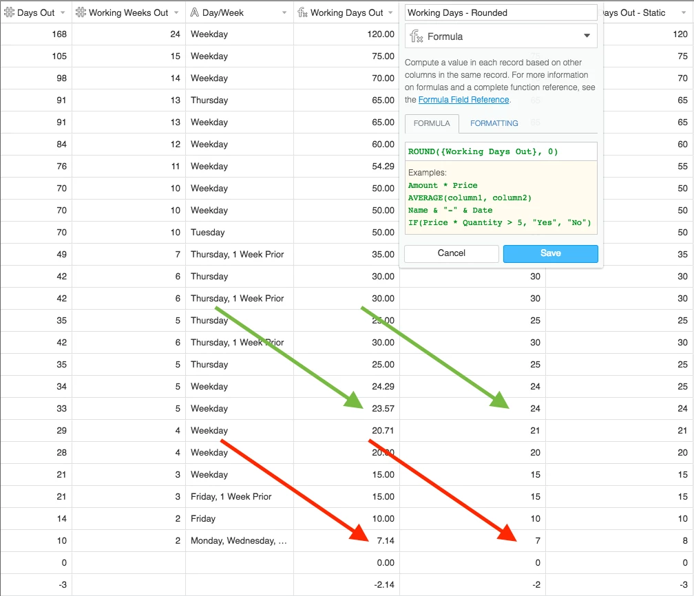 If you want to force the ROUND function to work like a ceiling function, you can add 0.5 to the formula to force it to round up, i.e. ROUND({Working Days Out}+.5, 0). Hope this helps!