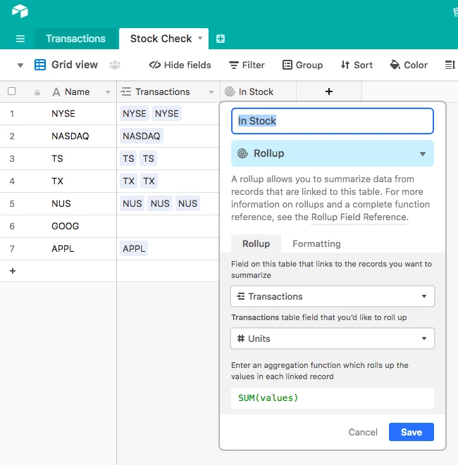 Hi can anyone help, I have created a table with share market transactions. Date/Stock Code/Buy/Units/Price that sort of thing. My problem comes when I want to accumulate the units in the same stock code. So if each row is a transaction how do I look back to see if there are units of a particular stock already in existence? Very simple in Excel but I just cant seem to figure out a simple way in Airtables.