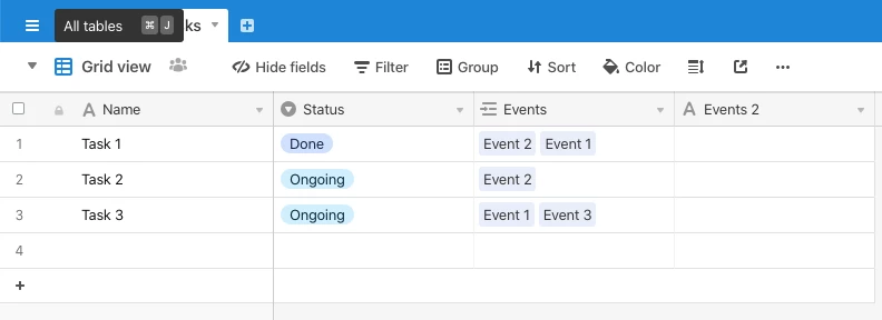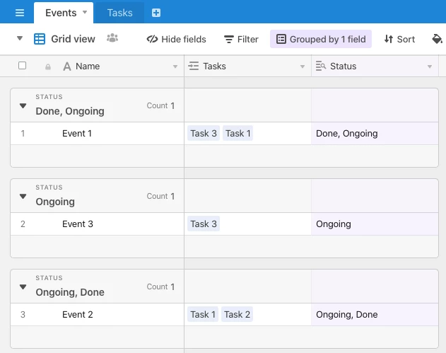 I have an EVENTS table and a related TASKS table. The Tasks table as a field for Status where I mark tasks “Done”.