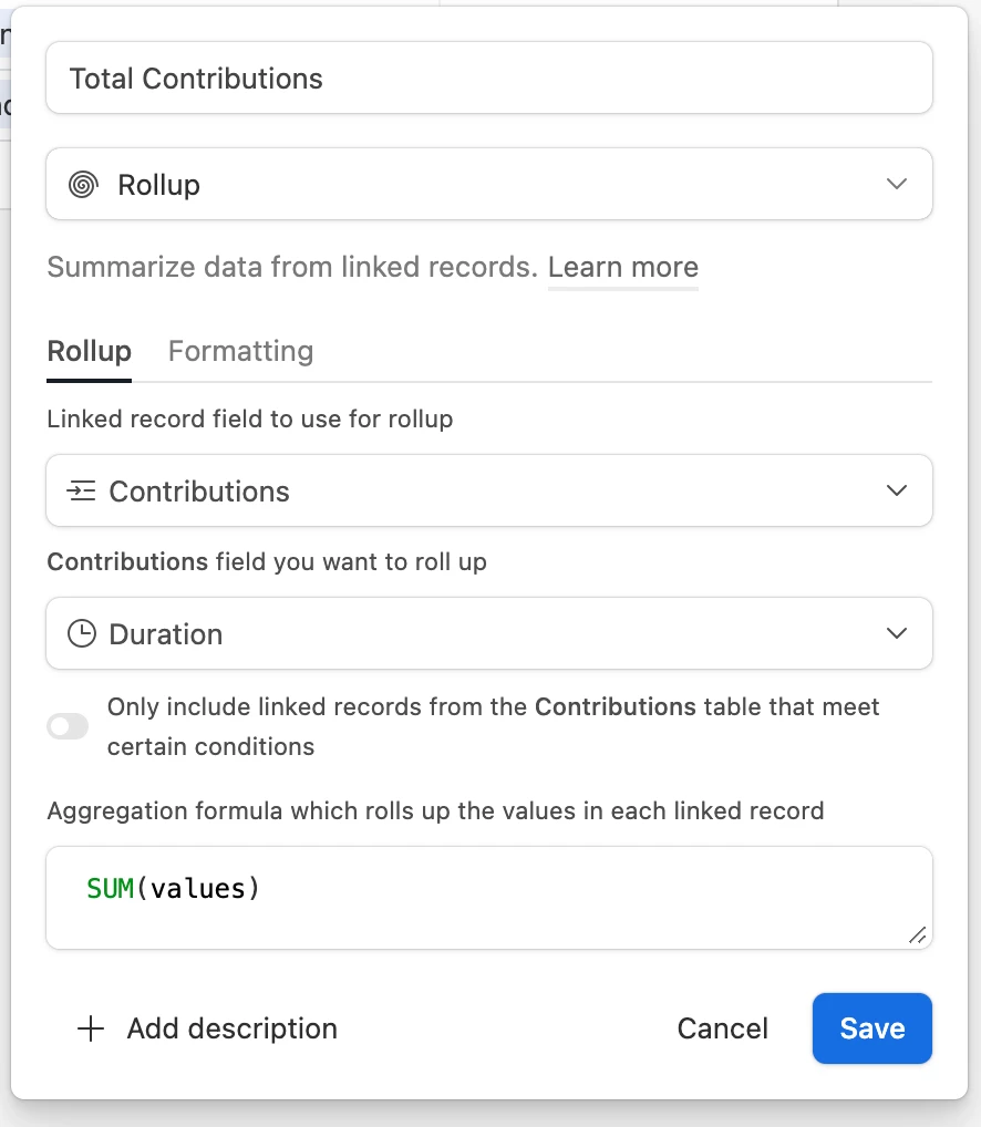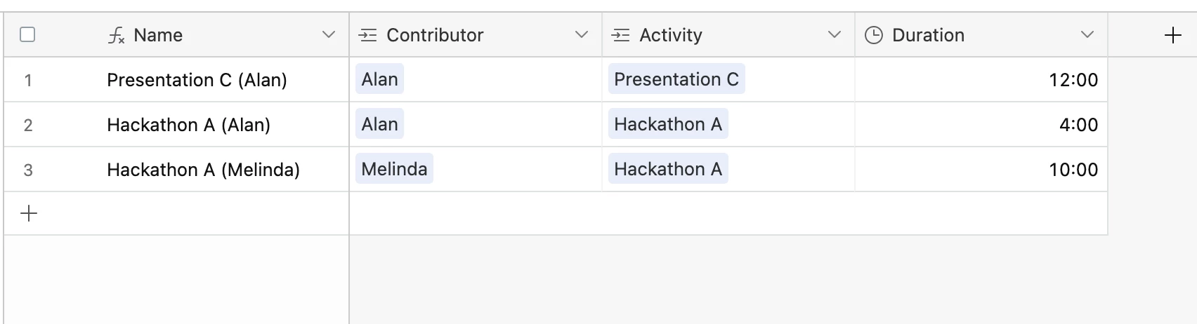 Now, I would like a field Total contributions in CONTRIBUTORS that sums up the Duration of CONTRIBUTIONS per Name. 😊