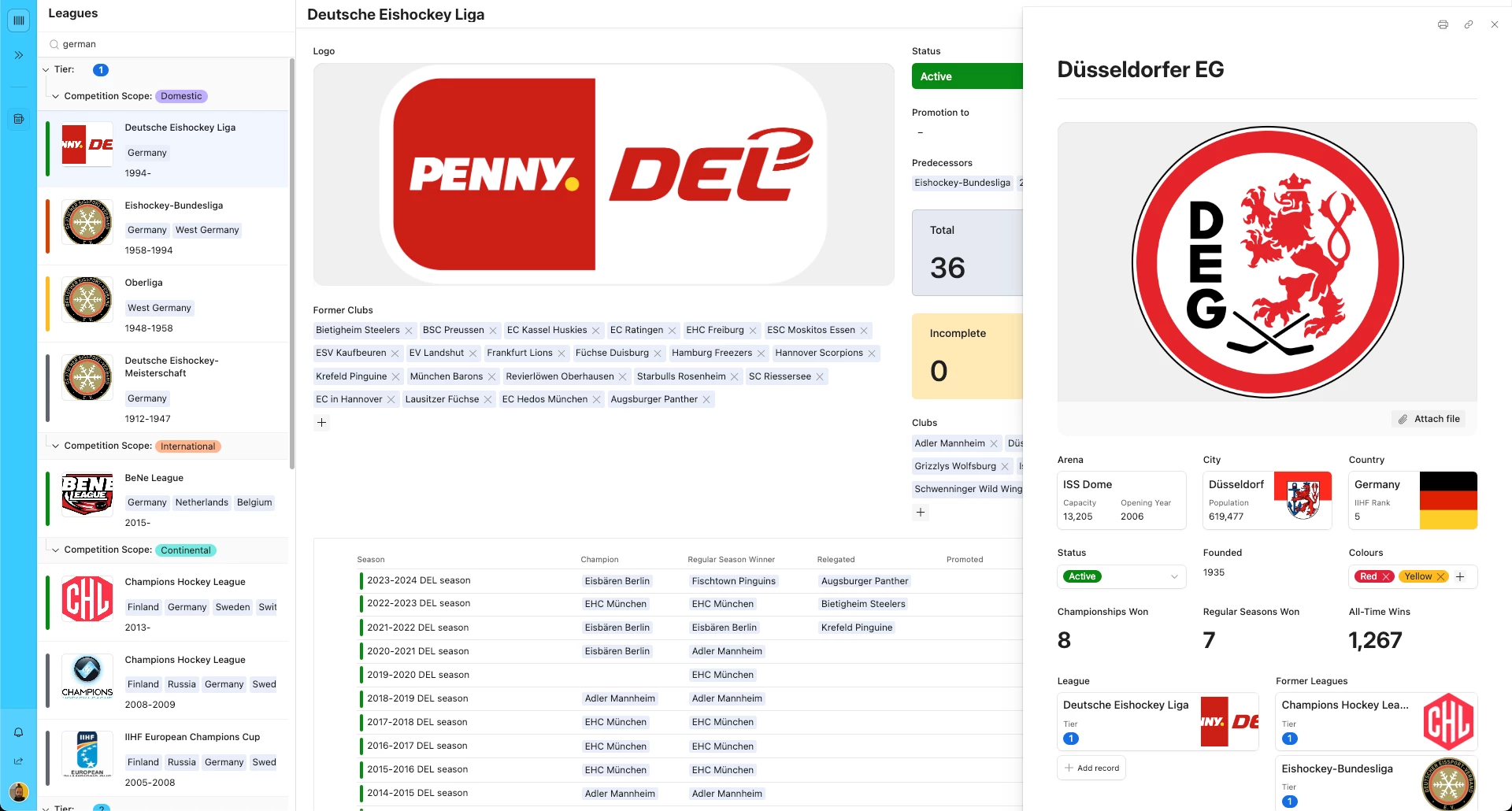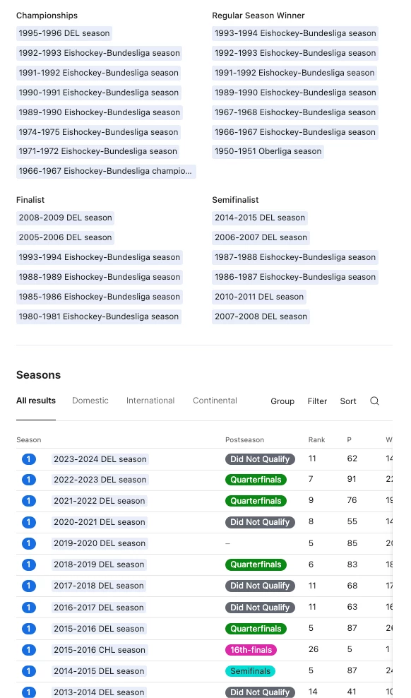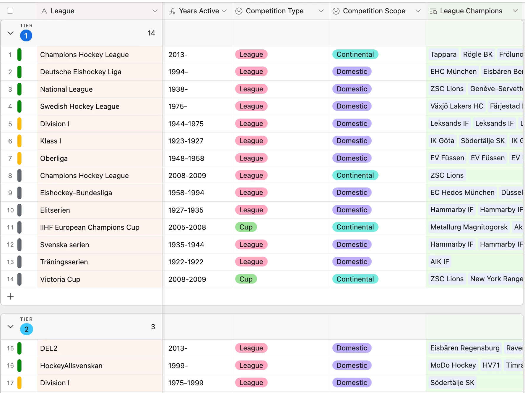 I would like to be able to use this in an interface for each league, where I can use an element to create a table/list that shows how many times each club won that league (e.g., Färjestad BK were league champions 9 times, Växjö Lakers HC were league champions 4 times). Alternatively, I would even be okay with a formula field that returns a list (e.g., returning something like "Färjestad BK (9 championships), Växjö Lakers HC (4 championships)"). I am struggling to figure out a way to make either of these happen.