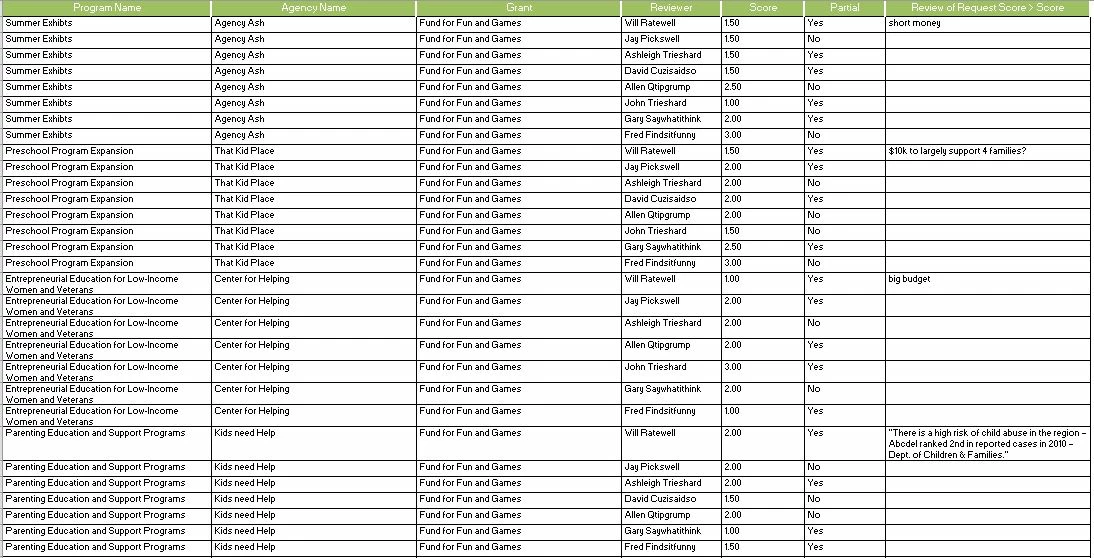 When I export the scores I get a spreadsheet that gives the score by reviewer. There is a row in the spreadsheet for every application with the scores of the eight reviewers. _Mind you, the likelihood of data getting mixed up and the human error factor - using a spreadsheet to analyze the data is torturous _