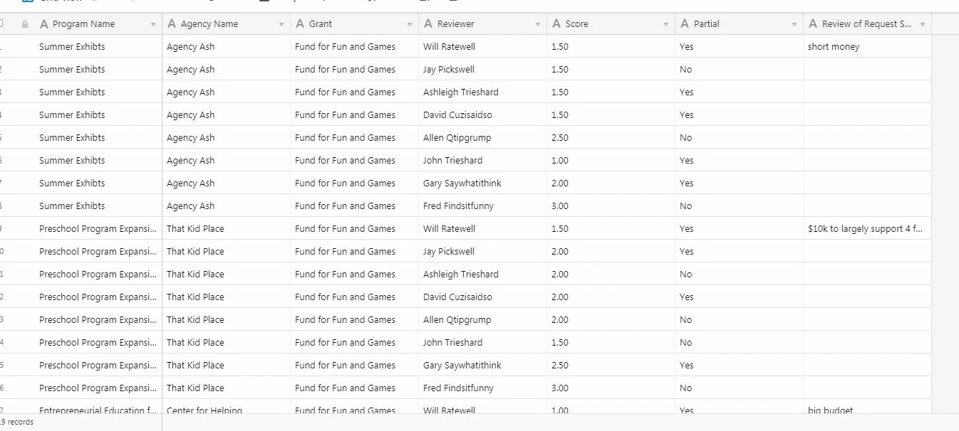 Ultimately I want to create a table that will do the calculations to get the average scores for each program and then create a form where I can give the reviewers the results of the scoring (sorted by high to low) and show them what their score was.