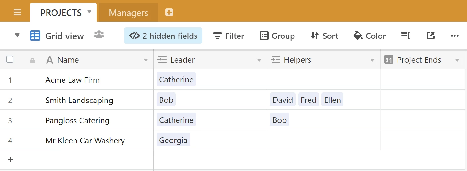 Now, a more basic critique of my own suggestion. Your problem sounds to me like it could use a many-to-many relation. A given project can have more than one leader and/or helper; and any person can be linked to more than one project. If you explore the Airtable help for many-to-many relationships (look especially at the classes and students example) you may be able to build a more sophisticated version of this base that comes closer to what you want.