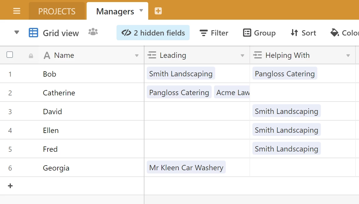 Now go back to Projects, add in a few project records, then switch to People and add some people. In the appropriate columns, link each person to the projects he or she is leading or helping with.