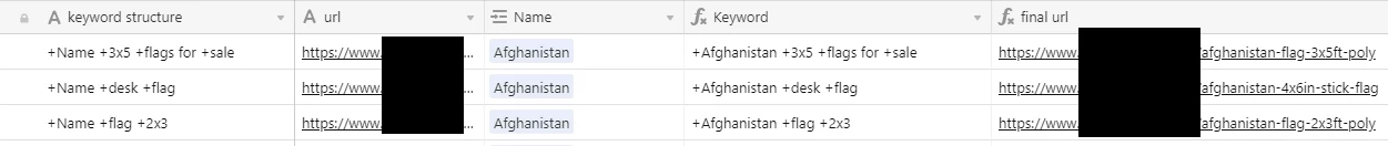 I have a table for building keywords and final urls to input into Google Adwords. It helps when I’m launching new ad groups for similarly named items in different varieties.