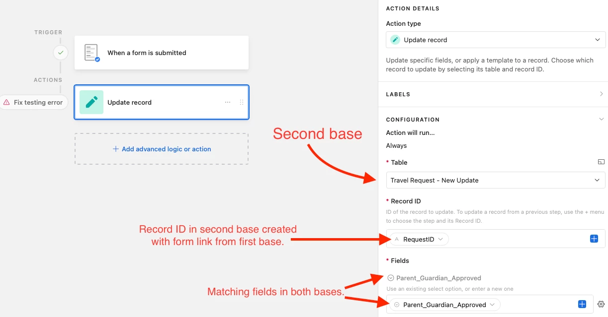 My problem seems to be with the automation. I am using when the form, from the second base, is submitted to trigger the automation. I then added update record to the automation. Based on a video covering the topic by Julian Post, I list the second table called New Update as the Table in the configuration. I list RequestID from the second table as the Record ID. For testing purposes, I add just one field in the Field section. I set it to dynamic and map the corresponding field with the same name and parameters. (I started by duplicating the first base, so I know the fields are exactly the same.)