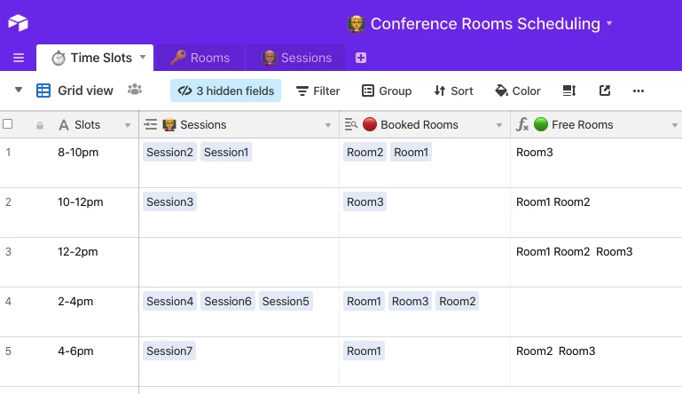 I’m designing a conference that has multiple sessions running at the same time, and I thought I would use Airtable to keep track of what sessions are scheduled in which rooms at what time.