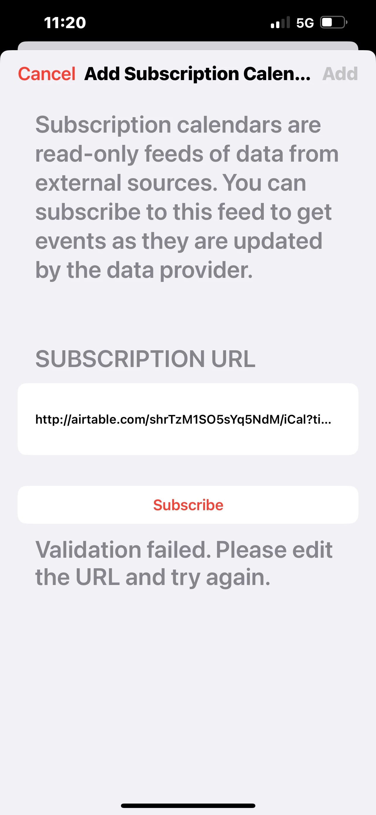 I have a calendar view in one of my bases. I went to share view, sync to an external calendar and copied the link. I sent this link to a user via text. I had the user right-click and select copy from the text message. I then had her go into apple calendar, calendars, add calendar, add subscription calendar, paste the URL in the subscription URL field and click on subscribe. She then gets the message "Validatioin failed. Please edit the URL and try again" I tried the same steps at the same time she did in my own calendar and it worked fine. What could the issue be?