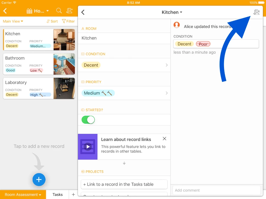 In the expanded record, if you tap the top right icon (see below), it’ll open that record’s comments and activity.