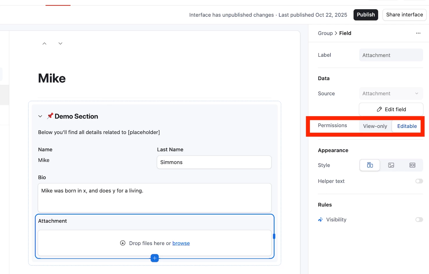 If you’re working with an interface, make sure that that field is set to “editable” instead of “View-only”.