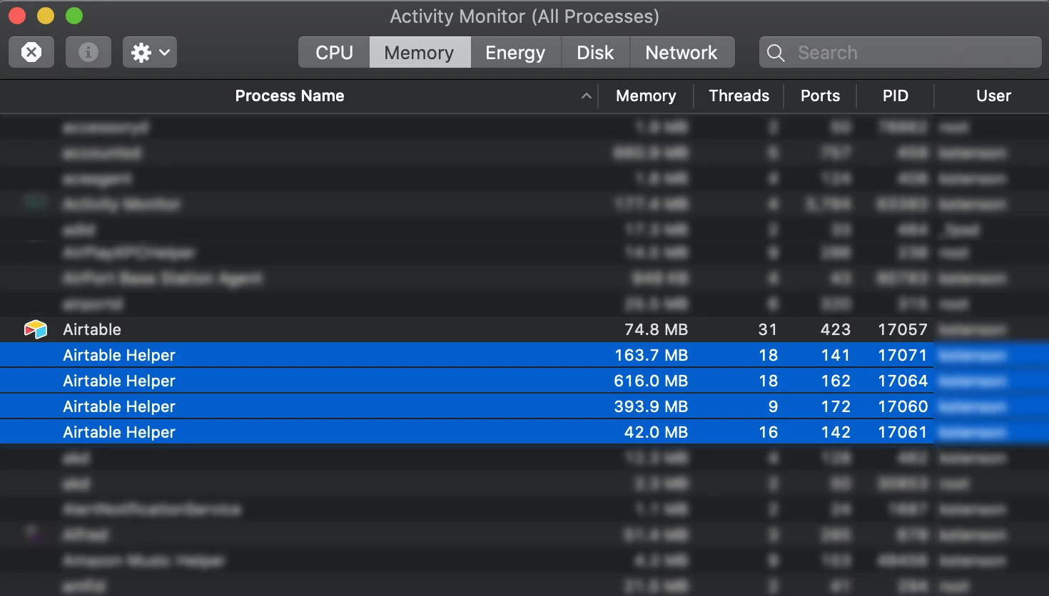 My iMac seems to be bogged down lately, so I checked “Activity Monitor” and the list shows a bunch of"Airtable Helper" rows, each using a decent amount memory (screenshot included).