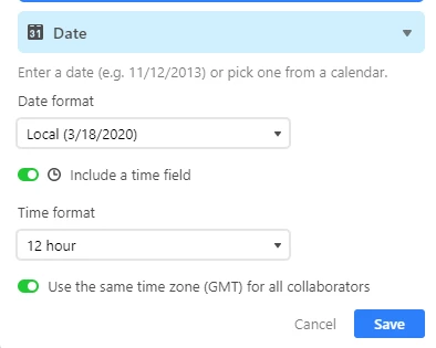 - the format settings for the date/time field