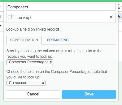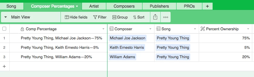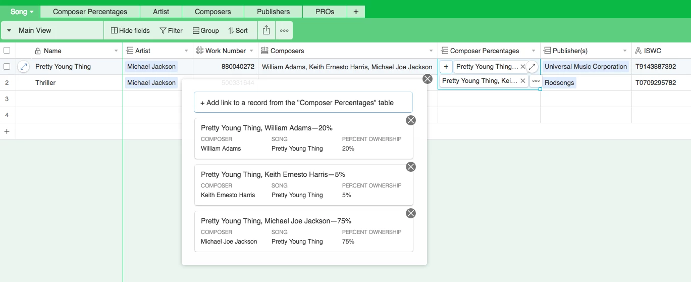 First, I have my table of songs. This consists of: Song Title, Artist, Composer(s), and Publisher(s). Everything fills out nicely, until I get to the composer(s)/publisher(s) fields. Since different songs have varying numbers of composers, I linked it to the composers table, and checked “Allow linking to multiple records”. From here, though, I also must assign what percentage of the song is owned by whom.