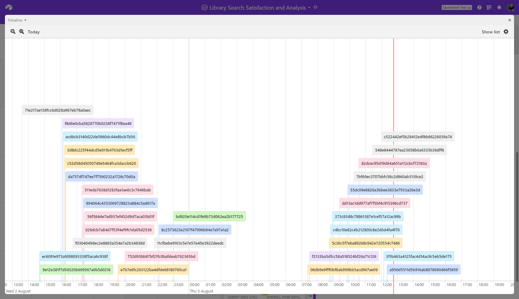 Below is a timeline visualisation block of the responses from the first 23 hours of the survey deployment. There are 7 colours (single select field - hopefully this can be a calculated formula field in future :pray: ) representing the scale of overall satisfaction, from red and yellow - extremely and moderately dissatisfied, through to light blue and green - moderately and extremely satisfied.