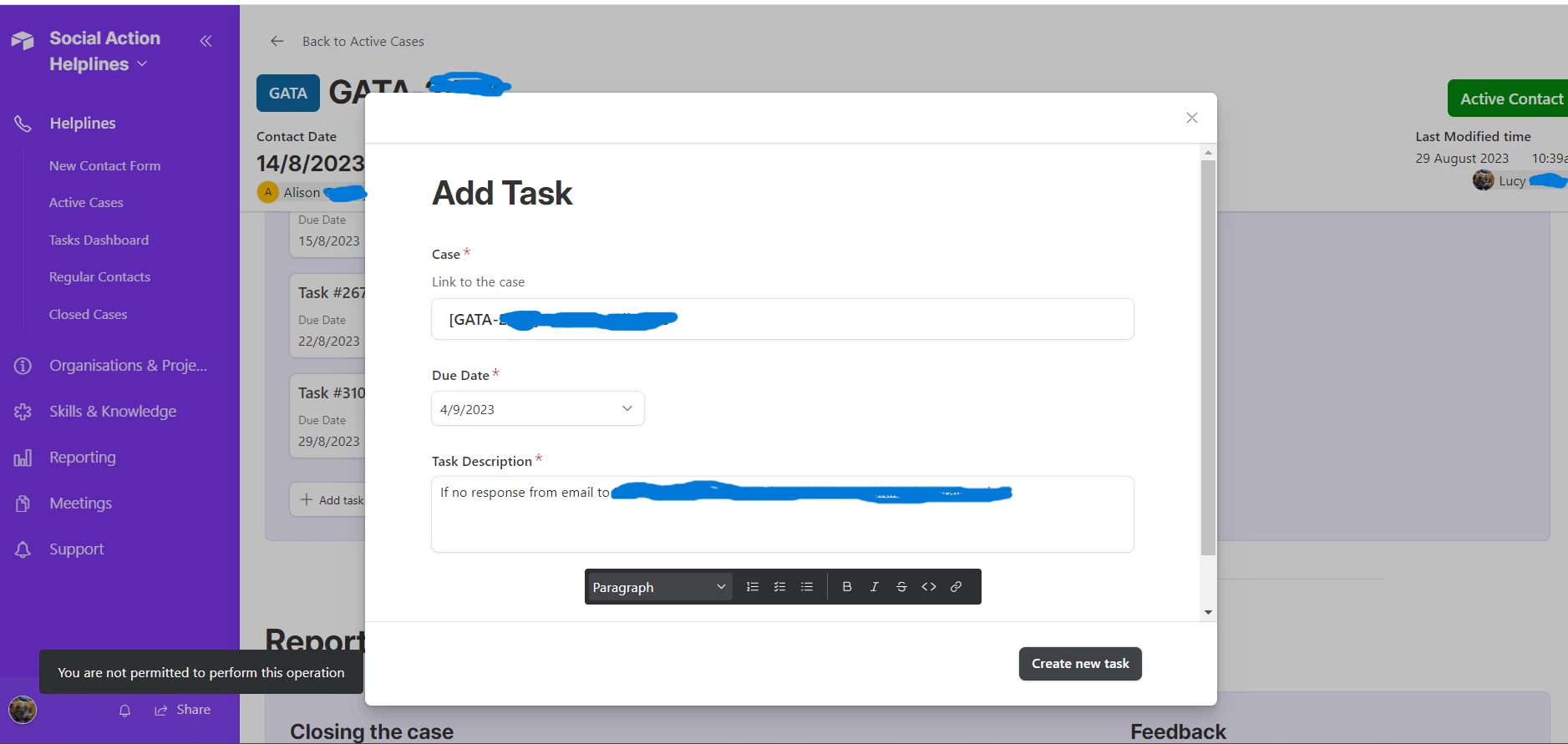 Today our team were all stopped from being able to create Tasks on our Active Cases. This is done via a Linked Field. When trying to create a new Task, all the team received the error message "You are not permitted to perform this operation". A few details below if they're helpful: