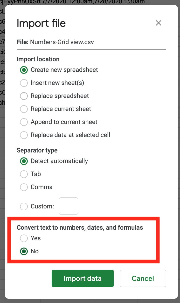 In Google Sheets, one way to fix this problem before importing the CSV file is to turn off the option to “convert text to numbers” that shows up when you import a CSV file. See screenshot below.