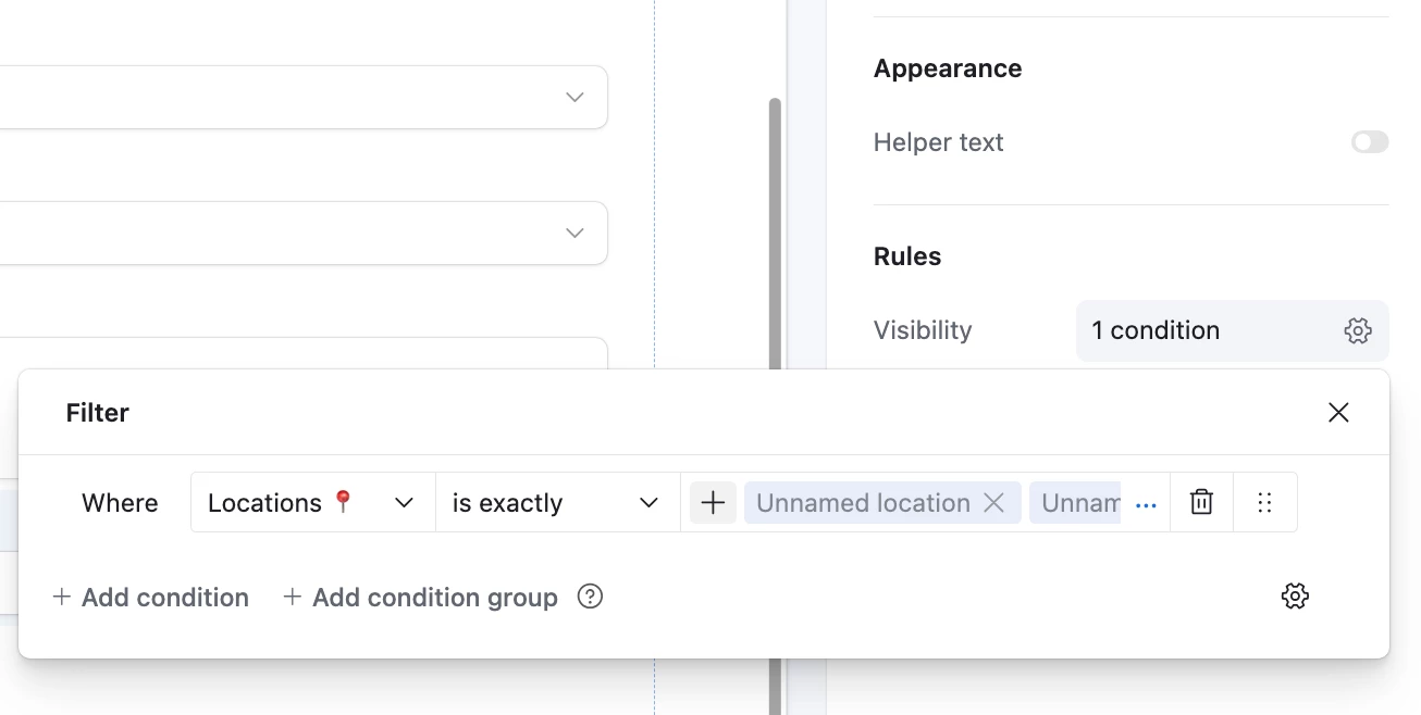 If a linked record field is configured to show a display name instead of the Primary Field, the same display value should be used consistently in the Visibility Conditions builder, or at least resolve to a readable value instead of “Unnamed.”