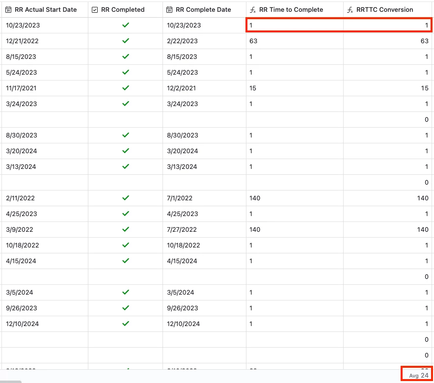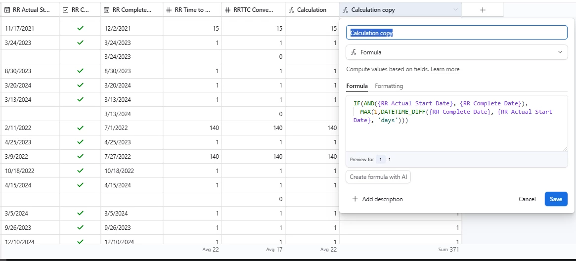 The {Raw_RR_Diff} field is a FORMULA column that contains DATETIME_DIFF({RR Complete Date}, {RR Actual Start Date}, ‘days’). It is also formatted as Number with no presets and zero decimal places.