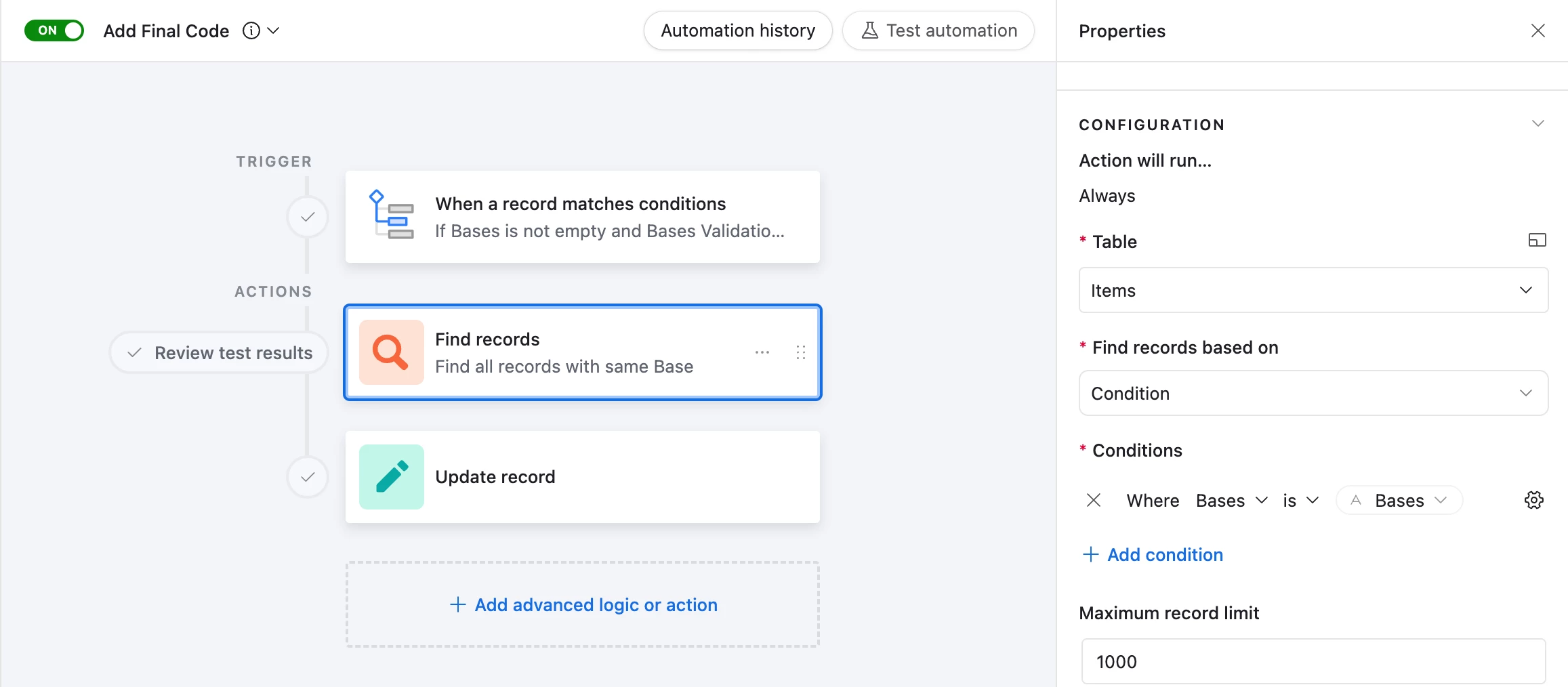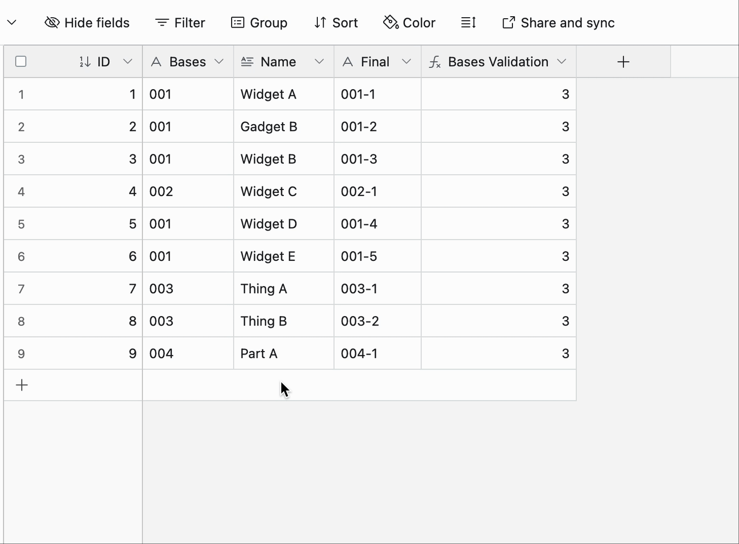 Back in the main table, the base items became links to records in that other table, with a lookup field pulling in each item’s unique ID, and then the rest of the system flows as outlined above, operating on that ID instead of the item itself. Once the item’s unique number is calculated, it’s combined with the original item.