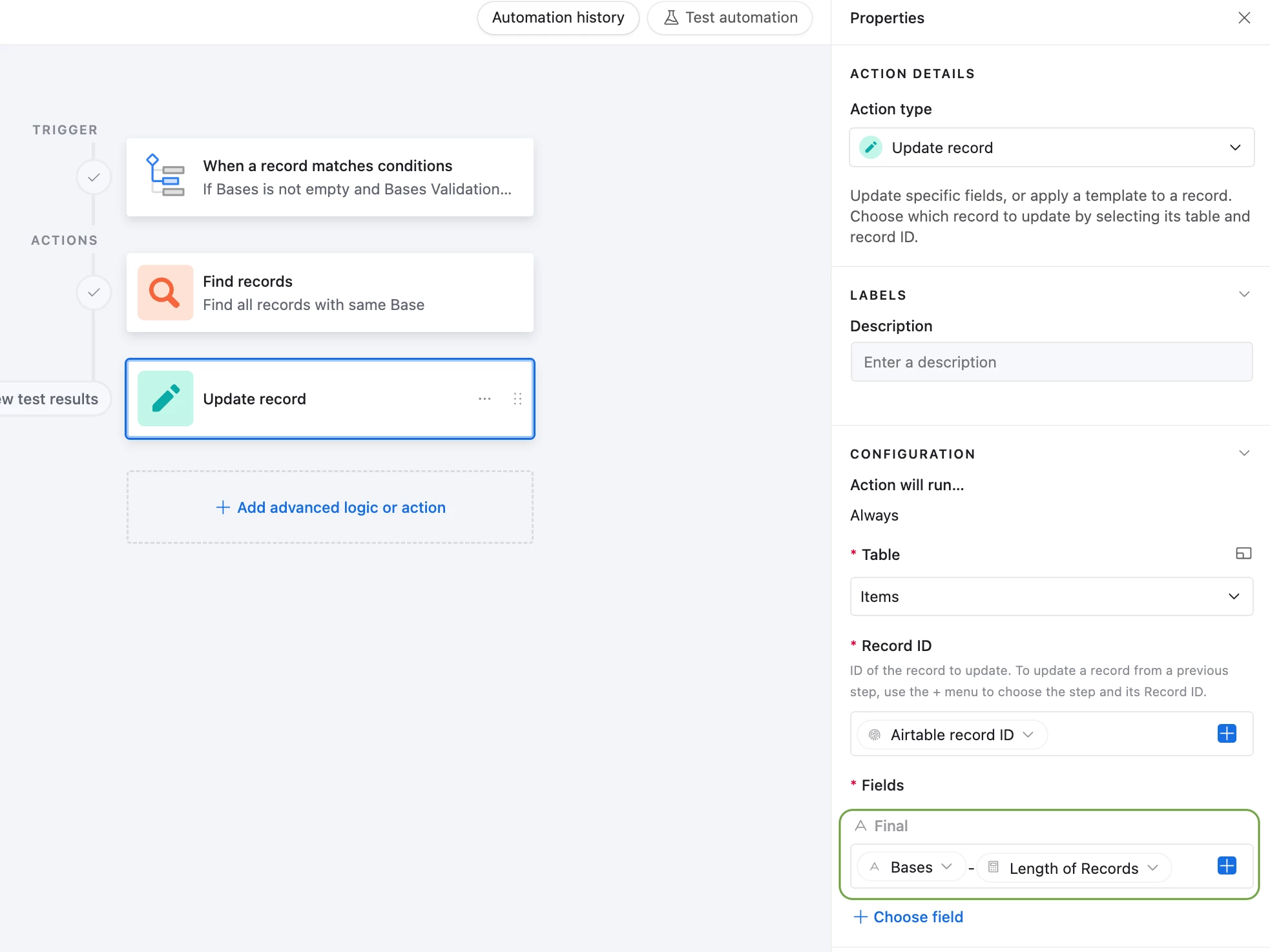 {Substitute}field then takes that tally and removes all instances of{Unique Base}, leaving everything else except that item. - The length of