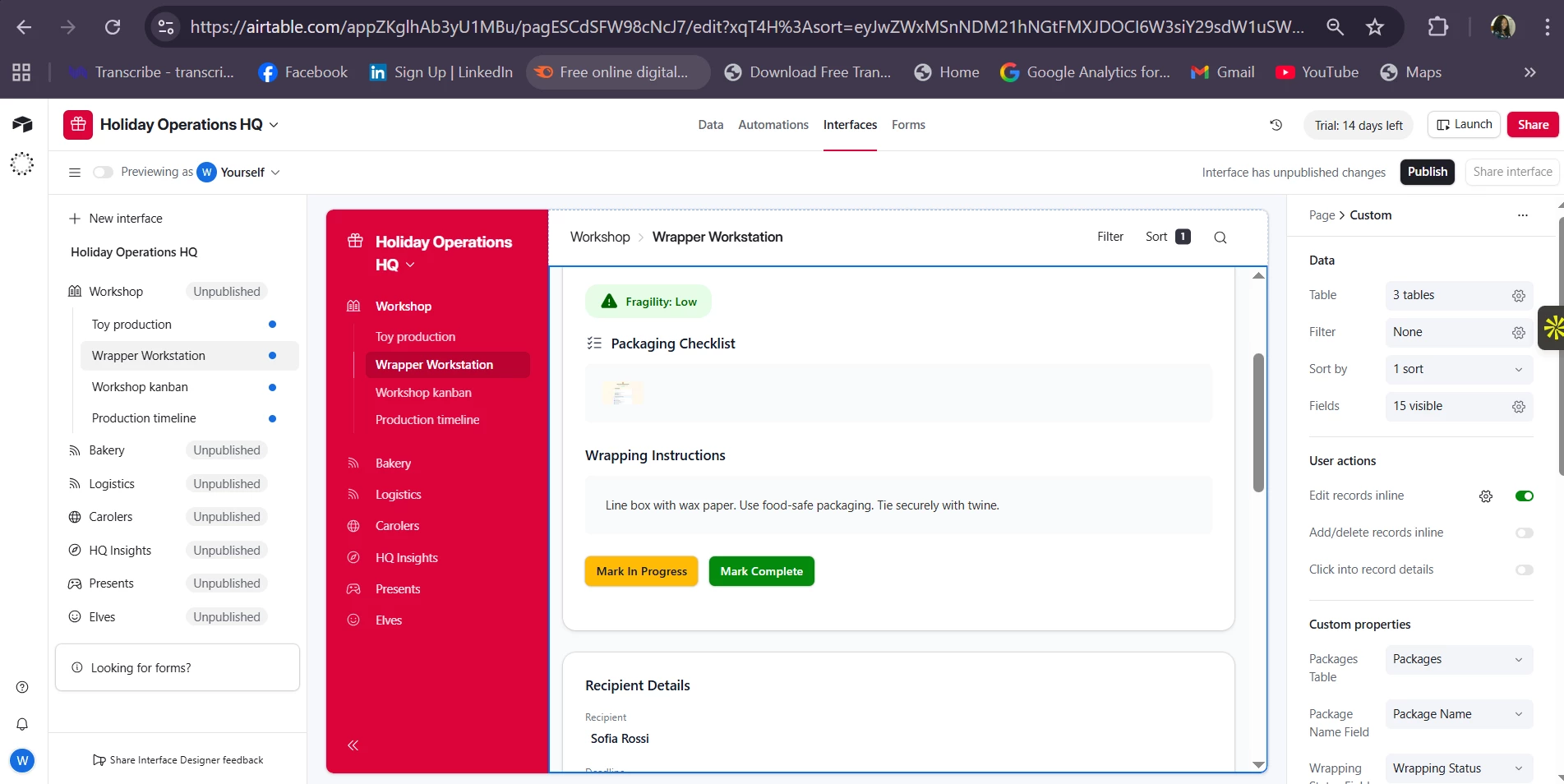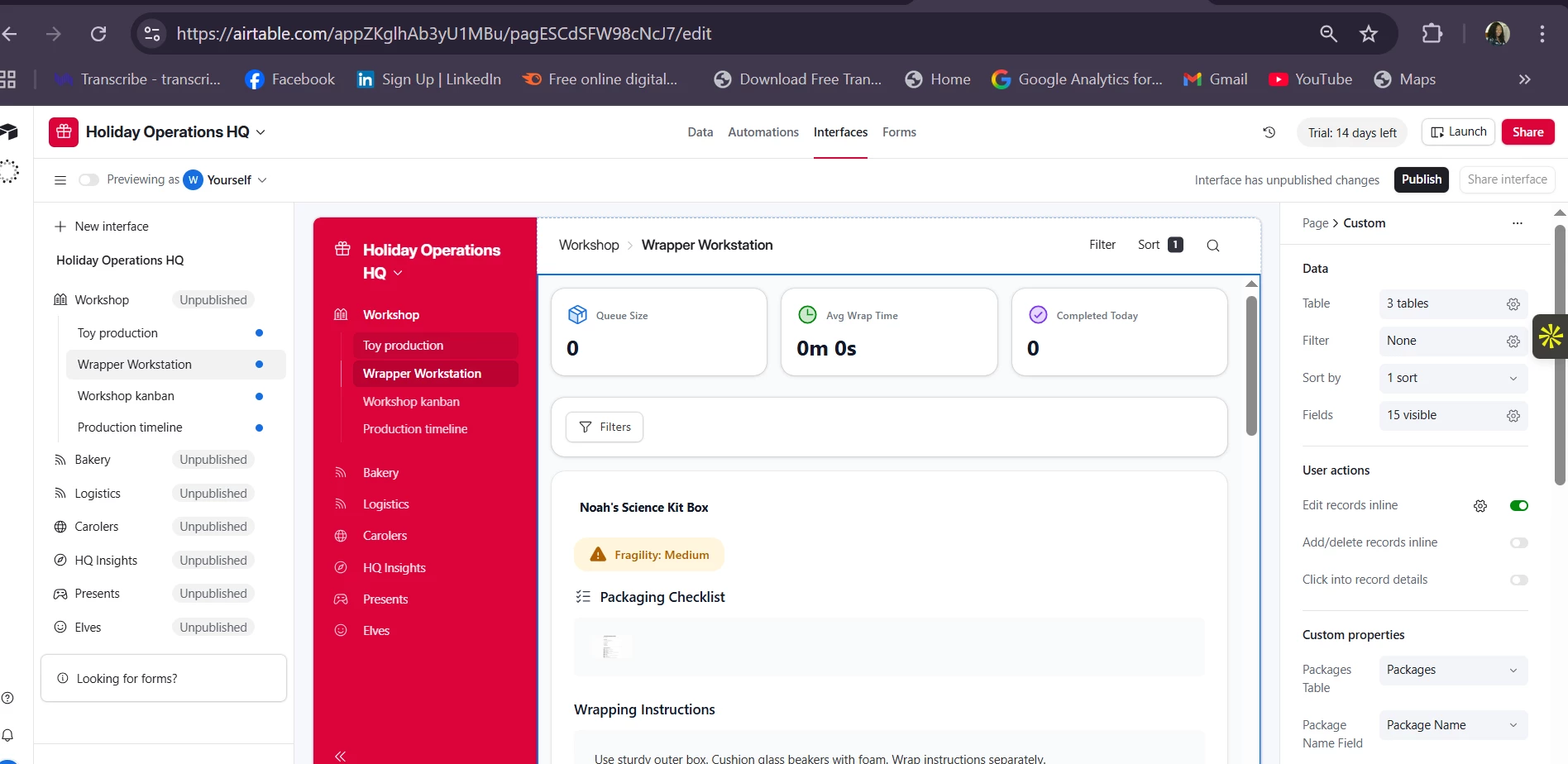 “Using the Packaging checklist prototype field, generate a proposed Airtable Interface layout for a ‘Wrapper Workstation.’ Include recommended sections, components, KPIs, filters, and suggested interactions.”