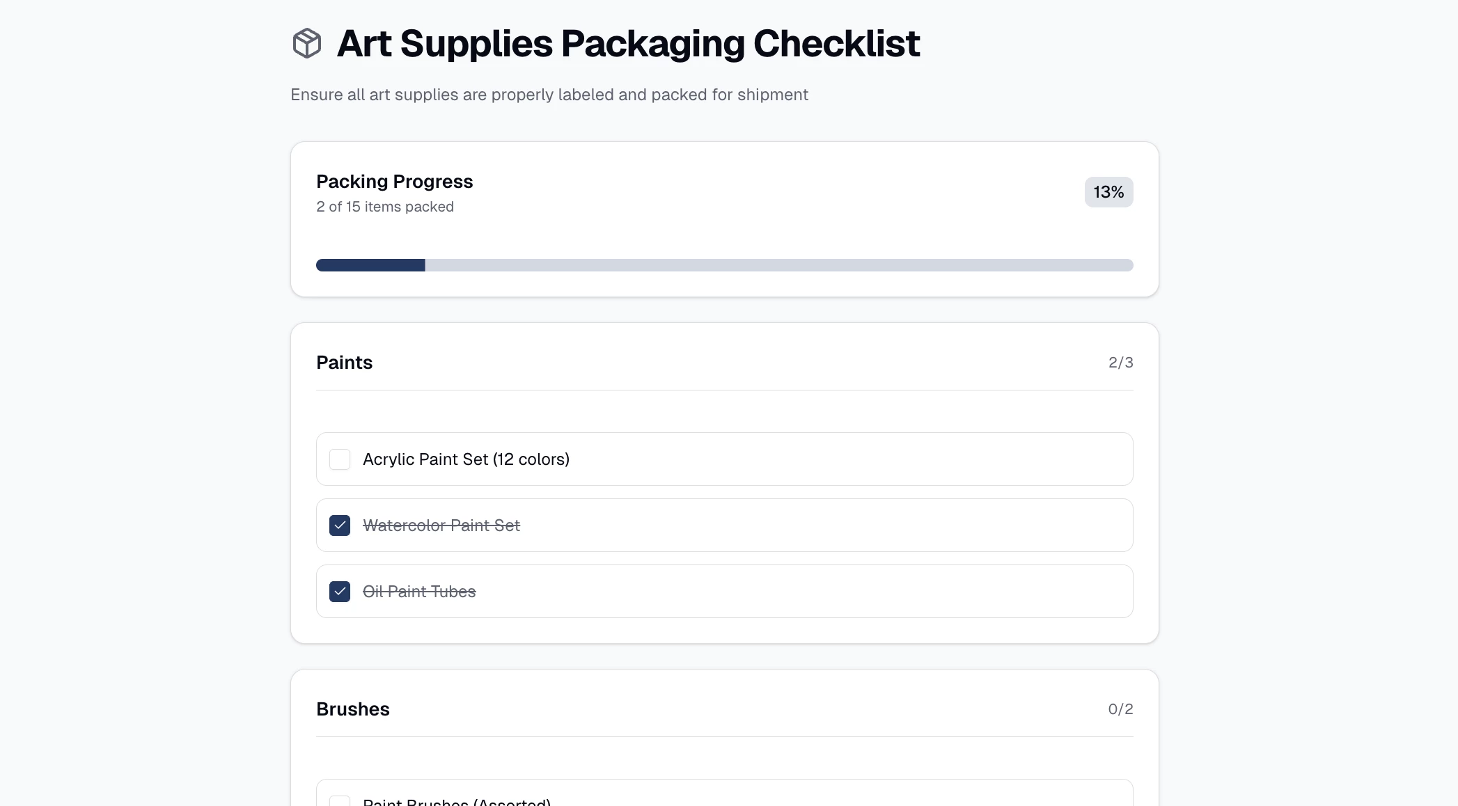 Try asking for a packaging checklist, supplies checklist, or a prototype with a progress bar to track the steps needed to complete the package.