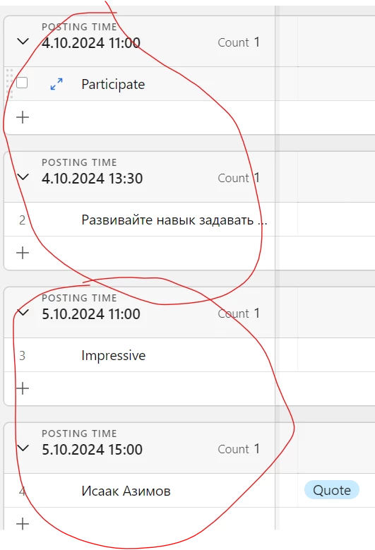 How to group rows by date so that groups are formed by day, without taking into account time. To get a group of October 4 with 2 rows and October 5 with 2 rows. I understand that the question is in the time display, but if you make a separate column with the formula DATETIME_FORMAT({Posting Time}, 'DD MM YY') and then group by it, then the program takes the date for text and sorts without taking into account the month, only by day.